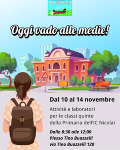 Dal 10 al 14 novembre, gli alunni delle quinte del nostro Istituto, nel giorno stabilito per ogni classe, verranno accompagnati dalle famiglie nel plesso della Scuola Secondaria di I Grado (in via Tino Buazzelli n.120) dove saranno accolti dai propri insegnanti della scuola Primaria e da alcuni docenti della Secondaria.