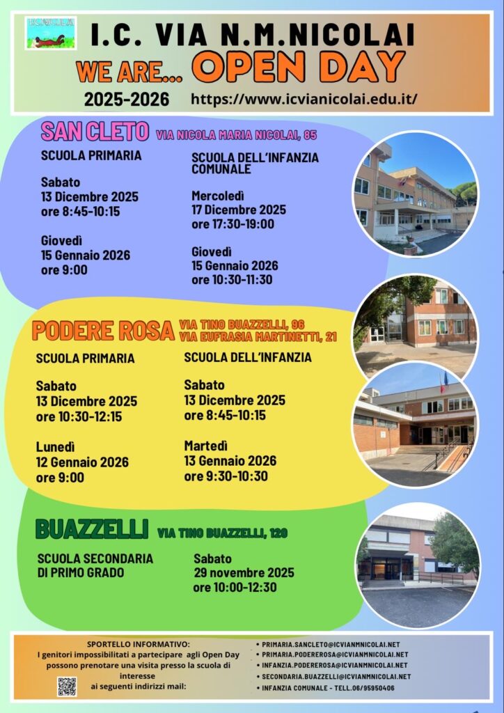 Vi aspettiamo per il prossimo Open Day il 13 DICEMBRE 2025, dedicato alla Scuola Primaria di San Cleto e Podere Rosa e dell’Infanzia di Podere Rosa, secondo gli orari riportati nelle locandina (vedi anche la PAGINA DEDICATA).